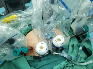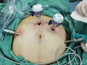 After intubation, the patient was placed in a cystolithotomy position with the buttocks higher than the head. An observation port was made 3 cm above the umbilicus and 1 cm near the median. Another two incisions of about 8 cm were made at the side. The fourth one is between the two incisions on the left. The surgical incision was selected as shown in Figures 1,2.