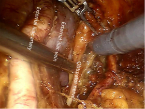 Pelvic lymph node dissections are always the center of the surgery. After the resection of the lymph nodes from the lateral side of the external iliac vessel to the foot, the internal iliac vessels and the external iliac vessels were identified and exposed. The space between the obturator fossa and the lateral external iliac vessel was widened by blunt dissection, carefully exposing the obturator nerve and the vessel network below it, and gradually remove the pelvic lymph nodes. We called it U type dissection (Figure 4).